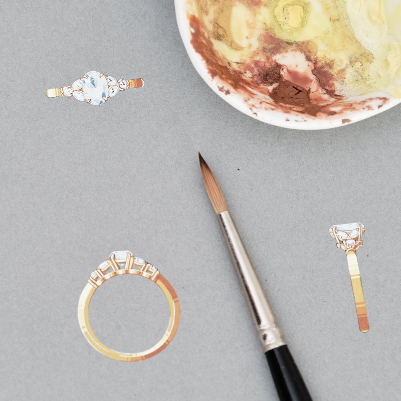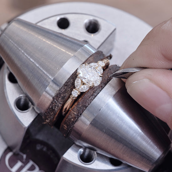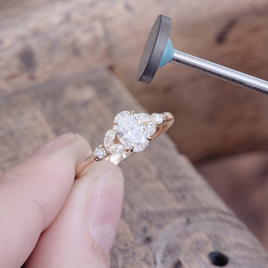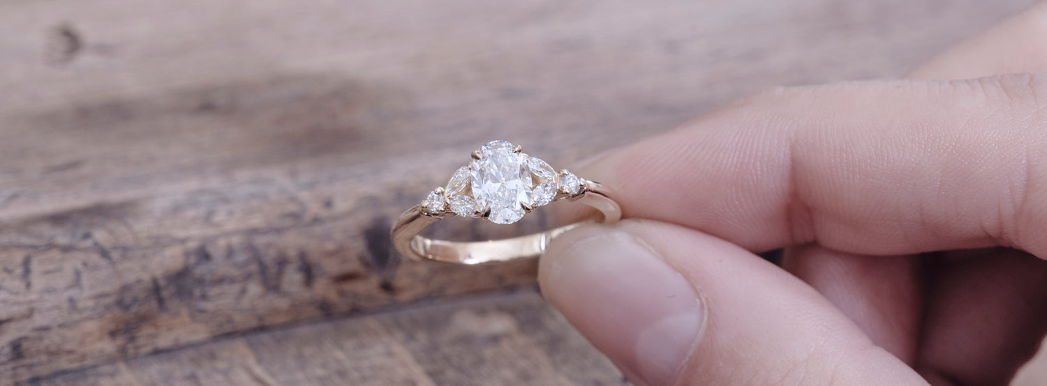 Cette bague sur-mesure est sertie d'un diamant taille ovale de 0,80carats, de diamants taille navette et de diamants ronds.