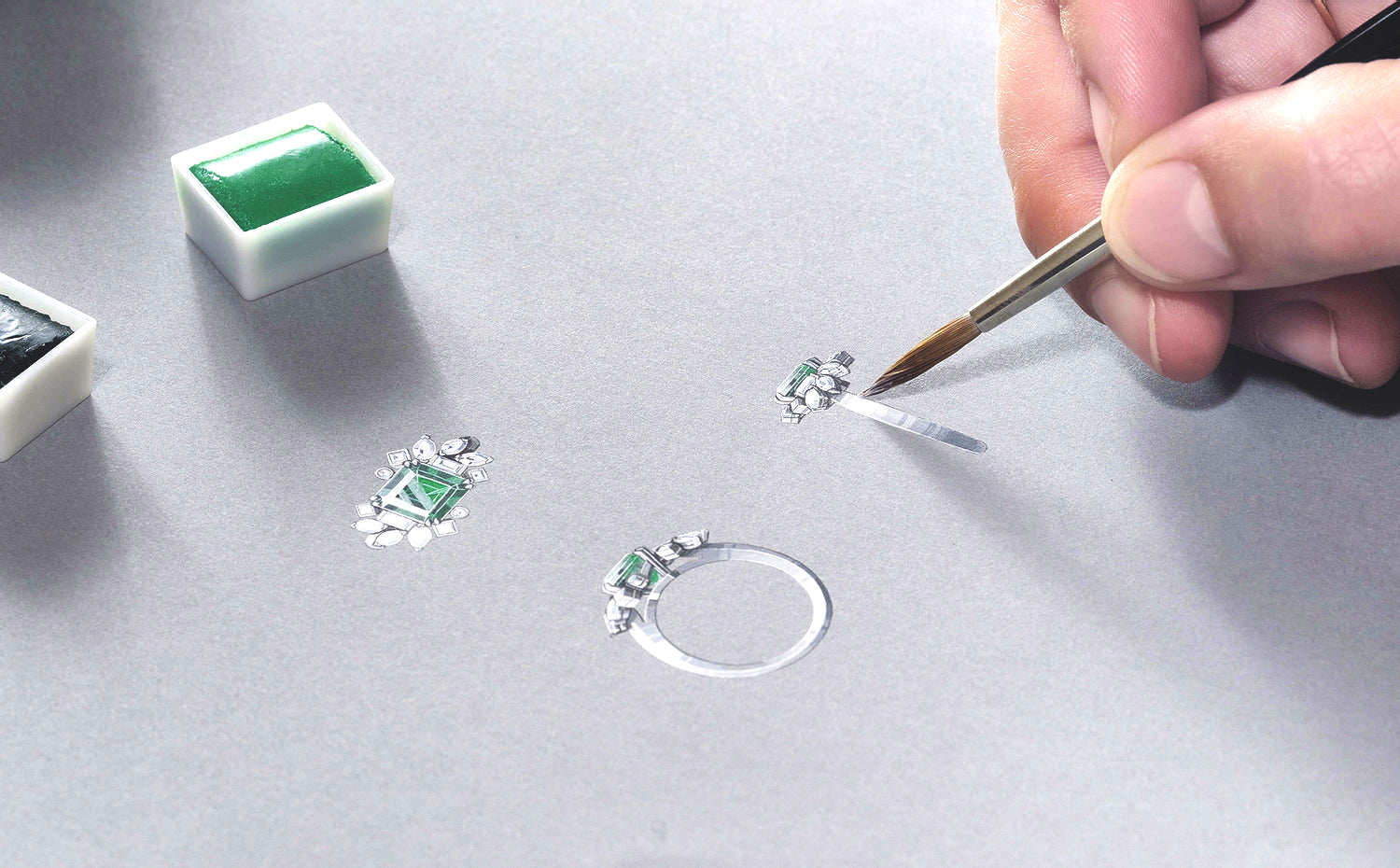 Le gouaché donne une idée précise de la future bague en révélant les couleurs, les effets de matière et en suggérant l’illusion du relief.